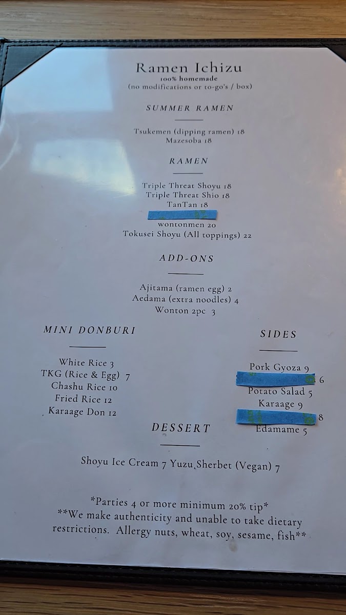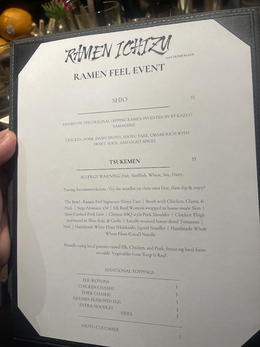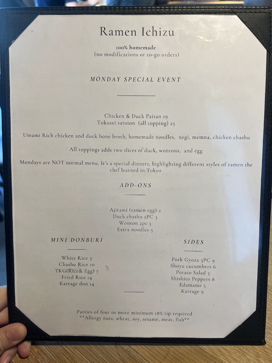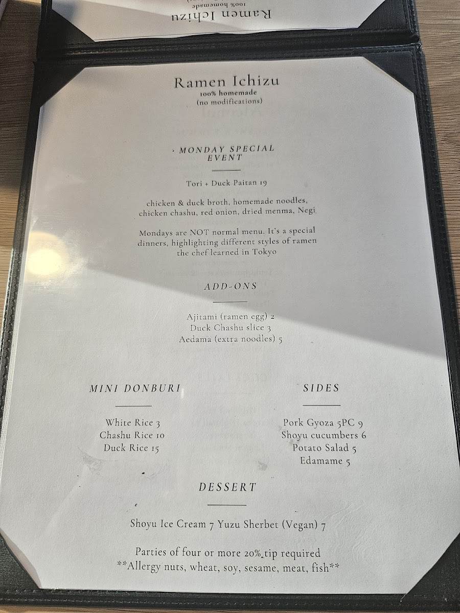 The menu at Ramen Ichizu Bar offers a thoughtfully simple selection that leans into comforting and authentic Japanese flavors. You’ll find classic ramen varieties like Shio, Shoyu, and Tonkotsu alongside inviting options such as Spicy Miso and Tori Duck Paitan. These bowls are perfect for a relaxed lunch or a casual dinner, providing warmth and satisfaction with every spoonful.